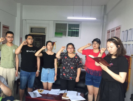 最后,在全体党员的鉴证下,在武嬿老师的带领下,全体预备党员起立,举起右手,握紧拳头,面对鲜艳的党旗庄严宣誓。全体预备党员激情澎湃的宣读入党誓词,激昂的声音、铮铮的誓言,深切的表达了对党的无限忠诚,明确了自己的责任使命,坚定了永远为共产主义事业奋斗终生的决心。余音不绝,经久不息的宣誓声音响彻整个会议室,将青年党员的风华正茂展现得淋漓尽致。