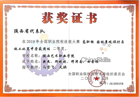 近日,2019年全国职业院校技能大赛(高职组)“园林景观设计与施工”赛项在杨凌职业技术学院落下帷幕,来自全国各地57支代表队的228名参赛选手同台竞技。学院美术系学生樊杰、邢娇娇、邓泽南、田希琛组成的参赛队代表陕西省参赛,经过激烈角逐,在众多参赛队伍中凭借扎实的专业技能,脱颖而出,荣获大赛二等奖,再创学院在该赛项比赛新高。