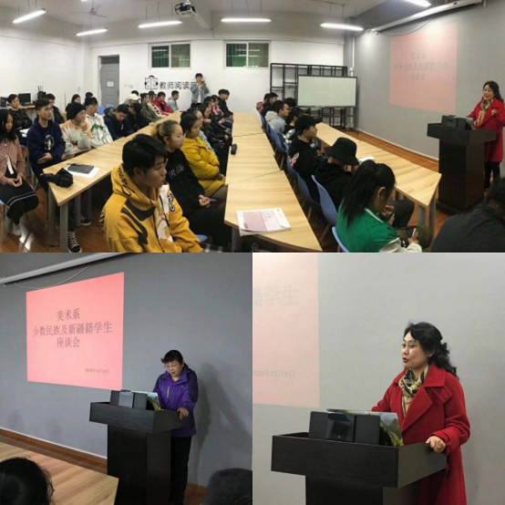 为进一步关心少数民族学生学习和生活,促进校内各民族学生和谐相处,11月6日下午,美术系少数民族学生及新疆籍学生座谈会在白鹿原校区2号教学楼5楼教师活动中心召开。座谈会邀请了省教育厅驻派我院主管新疆籍学生工作的马春梅老师,为系部少数民族学生和新疆籍学生讲解了热爱祖国、民族文化交流、民族文化传播等方面内容。会议由美术系直属党支部书记马爱军主持,行政秘书、辅导员、班主任,17、18、19级少数民族及新疆籍学生参加座谈会。