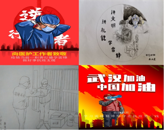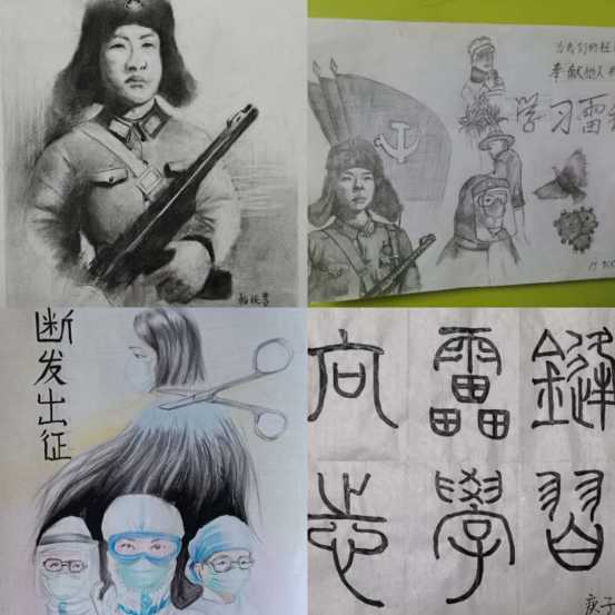 创作优秀作品,弘扬雷锋精神。美术系广大学生立足专业特色,运用手中的画笔创作了多幅优秀作品,通过素描、漫画、海报、书法的形式宣传雷锋精神,致敬在抗击疫情过程中涌现出的英雄人物,颂扬新时代的“雷锋”。
