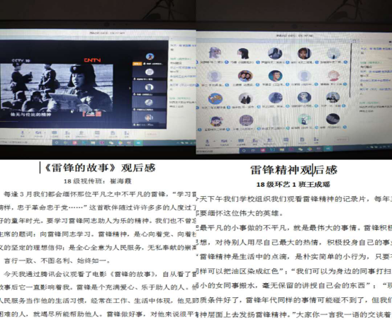 召开线上会议,学习雷锋精神。美术系18级利用腾讯会议,组织年级预备党员、入党积极分子、团学干部线上观看了纪录片《雷锋的故事》,在观看过程中大家热烈讨论、积极发言,谈感想,谈认识,进一步加深了对雷锋精神的理解。会议结束后同学们撰写了观后感。