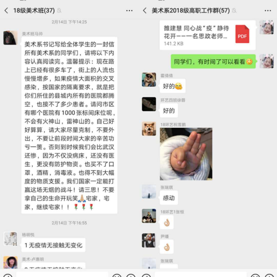 以书信形式传递战“疫”必胜信念。美术系直属党支部书记马爱军和辅导员雒建慧先后通过书信的形式向学生传递战“疫”信心,通过战“疫”中的英雄人物和英雄事迹,深化学生对爱国、责任和生命的认识,增强学生的责任担当和战“疫”必胜的信念。