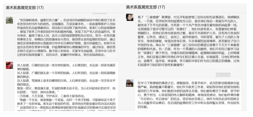 在学习后教师党员马雪飞说:“在突如其来的疫情发生以后,很多我们身边一直视为平凡的人,都变成了不平凡的英雄,尤其是一个个共产党员冲锋在最危险的战疫第一线,涌现了很多可歌可泣的“英雄们”,他们也是有家人、有需要他们疼爱、照顾的人,而他们自身也是血肉之躯,很多不光是医护人员,还有各行各业的警察、公务员、清洁工、农民工、超市收银员、司机等等,都为了人民的人身安全、身体的康复,体现出舍身忘我、矢志奉献的崇高境界,甚至献出了自己年轻的生命。“三秦楷模”这三位同志的事迹正是着千千万万个奉献者的缩影和代表。作为一个普通的人民教师,我们不但自己要学习这些“英雄们”勇于担当、冲锋在前的拼搏精神,疫情期间做好防疫、上好网课之外,我们还要正确引导我们学生们的正确人生观、价值观等,让他们把钟南山、袁隆平、钱学森、林俊德、李兰娟科学家们作为自己的真正的偶像,让他们知道学习知识的可贵性和重要性!”。
