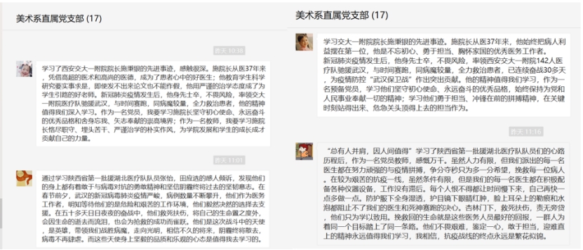 支部书记马爱军在学习后说:“挽救一个生命,就是挽救一个家庭。治好一个孩子的病,可能就是给孩子换来一生的幸福。医生这个职业的作用,是其他任何职业都没有办法比拟的。西安交大一附院院长施秉银率领第一批医疗队驰援武汉,他从医37年,多年来用行动诠释了“医者有仁术,更要有仁心"。抗击非典,参与汶川地震救援,在他眼里挽救每一名患者的生命都是头等大事;他带领的医疗队共收治患者119例,为国家提供疫情防控的方案和智慧;他是一名出色的医院管理者,以专业态度和医者仁心诠释着共产党员的初心与使命。“人不率则不从,身不先则不信",我作为一名党员,一名教师必须立足本职,兢兢业业做好自己的本职工作,牢固树立为人民服务宗旨意识,在后续的疫情防控工作中发挥党员先锋模范作用,听从学院统一安排,作出应有的贡献。”