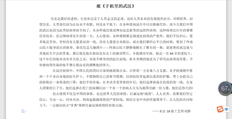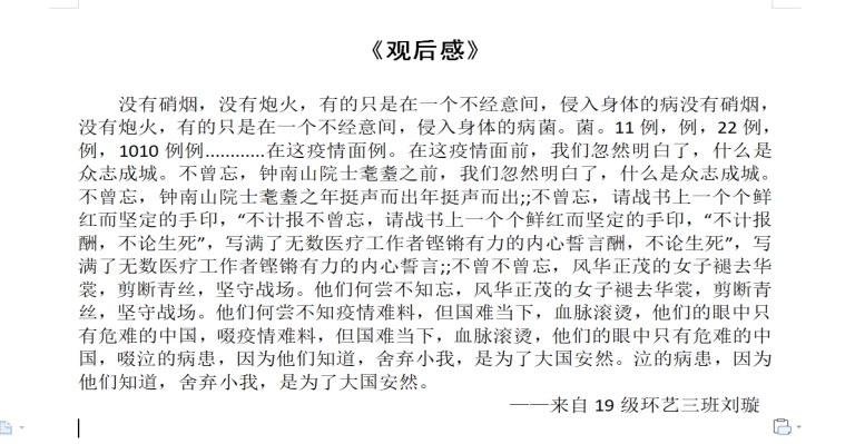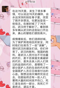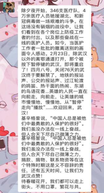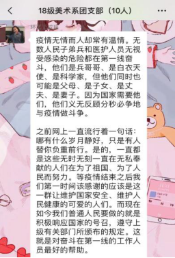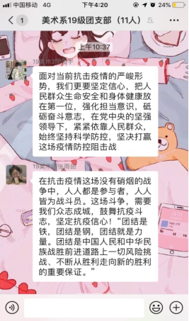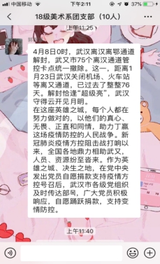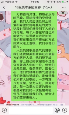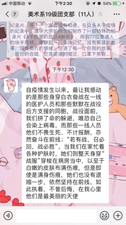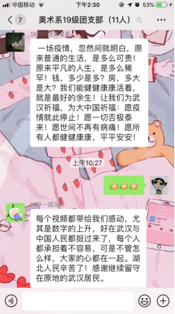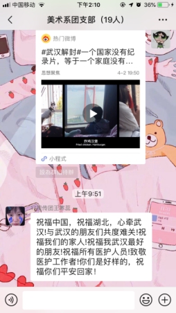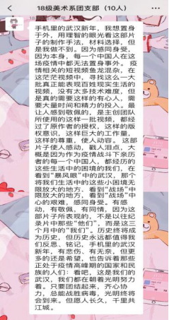 为铭记抗疫历程,感悟抗疫情感,激发同学们的爱国情怀,明确未来的责任与担当,美术系团总支学生会在延期开学期间充分利用网络资源,2020年4月13日在各级团支部微信群中,开展别开生面的“线上”主题团日活动:组织团员团干部观看特殊的纪录片《手机里的武汉》,同学们也踊跃发表了自己的观后感言并为冲在一线的防疫人员加油打气。