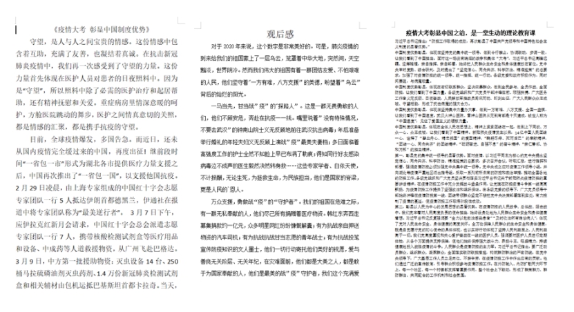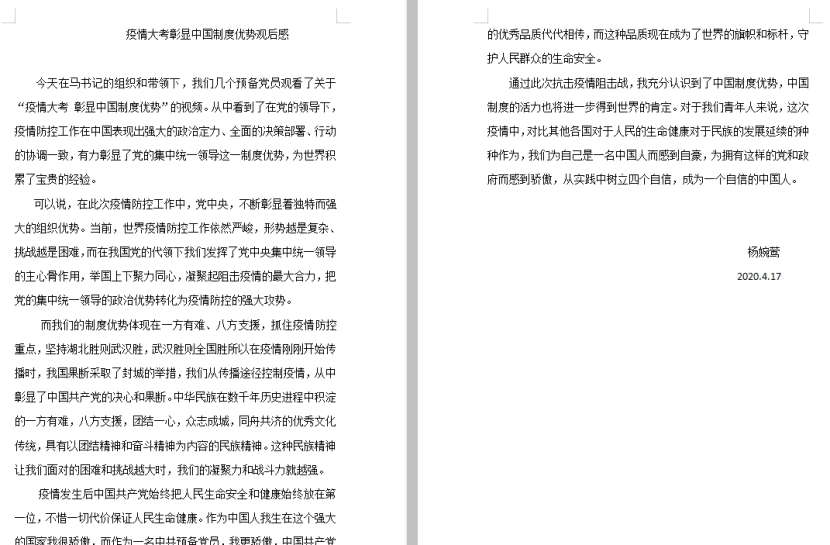 “疫情发生后中国共产党始终把人民生命安全和健康始终放在第一位,不惜一切代价保证人民生命健康。作为中国人,我生在这个强大的国家我很骄傲,而作为一名中共预备党员,我更骄傲,中国共产党的优秀品质代代相传,而这种品质现在成为了世界的旗帜和标杆,守护人民群众的生命安全。”杨婉莺同学激动地说。