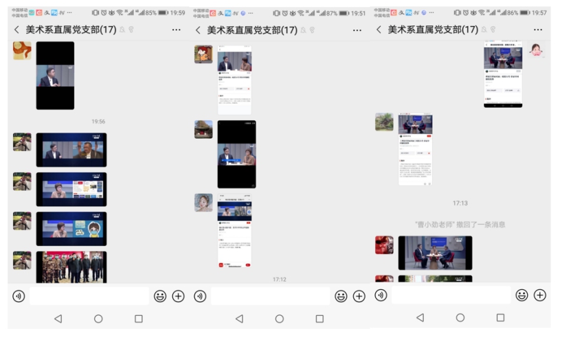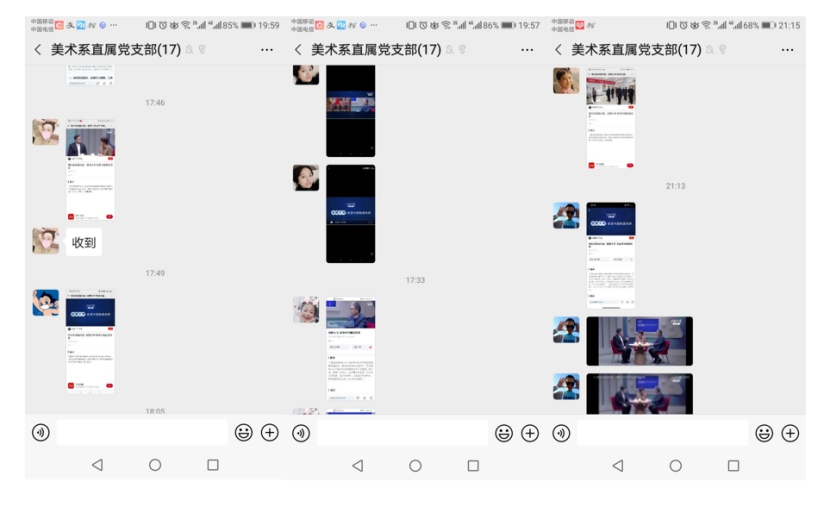 接学院宣传部通知,要求各支部观看省委宣传部制作的谈话类理论宣讲栏目《理论宣讲面对面》,4月17日,美术系直属党支部依托微信群在支部书记马爱军的组织下学习讨论《理论宣讲面对面:疫情大考 彰显中国制度优势》,支部所有党员及学生预备党员参与学习。