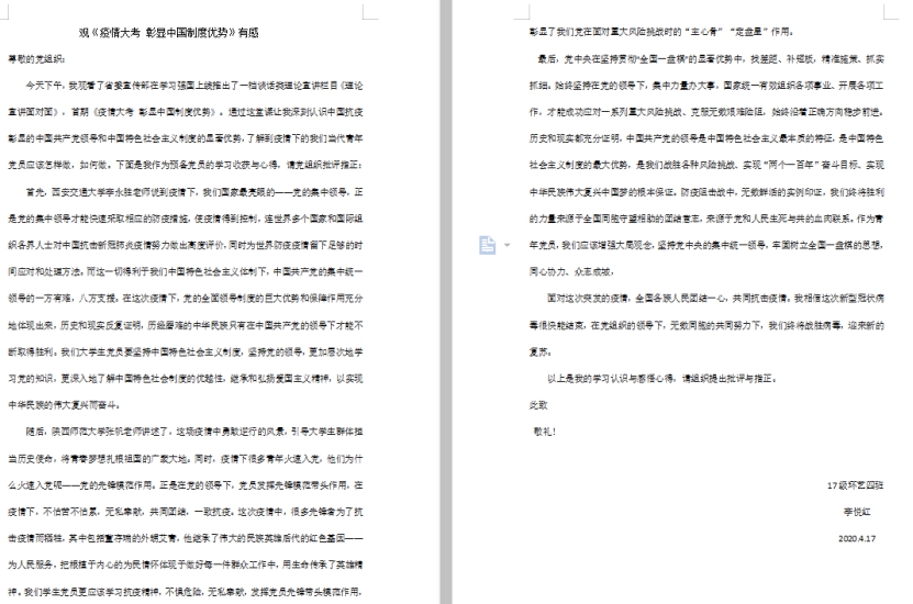 李悦红同学说:“通过这堂课让我深刻认识中国抗疫彰显的中国共产党领导和中国特色社会主义制度的显著优势,了解到疫情下的我们当代青年党员应该怎样做,如何做。作为青年党员,我们应该增强大局观念,坚持党中央的集中统一领导,牢固树立全国一盘棋的思想,同心协力、众志成城,面对这次突发的疫情,全国各族人民团结一心,共同抗击疫情。”