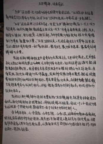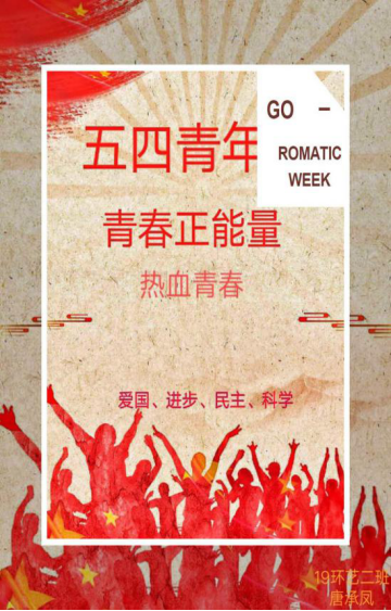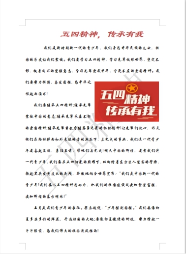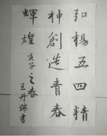 美术系团员发挥专业特长,运用手中的画笔通过制作主题海报、书法作品、提交心得体会来弘扬五四精神,用自己所擅长的方式来展示广大青年不畏艰险、勇挑重担、积极向上、奋发而为的精神面貌,并将这种精神传承下去。