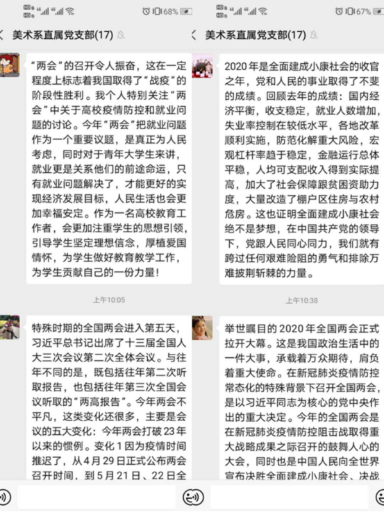 肩负人民重托,汇集民情民意。5月21日起,特殊背景、特殊节点的全国两会拉开了大幕。5月26日,美术系直属党支部利用微信工作群召开线上专题会议热议全国两会精神。