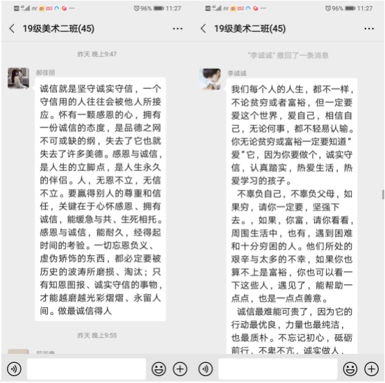 会上,各班班主任首先带领学生学习了学院下发的关于资助诚信教育的文件,并通过PPT演示、在线讨论、观看视频等方式对学生开展诚信教育、预防诈骗教育、套路贷警示教育等,在学生当中普及征信知识、金融知识、防诈骗知识,引导他们珍爱信用、理性消费,提高学生诚信意识、风险意识、法律意识和责任意识,帮助学生树立正确的人生观、价值观、消费观。