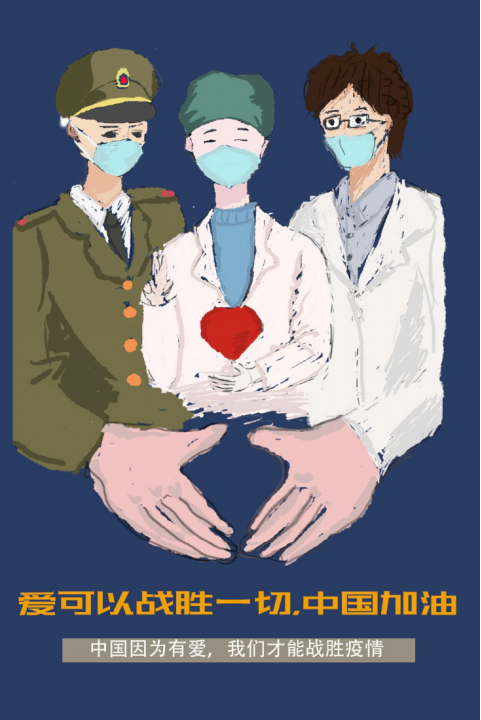 我以军人,医生和科学家,爱,来设计的,军人,是国家的象征,因为军人保护国家,保护人民,是我们坚强的后盾。医生,是我们战斗疫情的先锋兵,一直在第一线奋战,你们是最美丽的。科学家,是我们战胜疫情的希望,他们一直都给我们研制疫苗,有了他们就有了战胜疫情的筹码。爱,因为有爱,我们可以战胜一切。