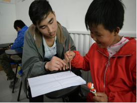 从陌生到熟悉,从疏远到亲近,美术系师生用热情和爱心温暖着每一个孩子的心。在认知室和美术室两个教室里,师生们与孩子们或手拉手交流、或示范表演、或拥抱、或谈心,展开了零距离、面对面、一对一的交流和沟通。有的老师教孩子画出了一个完整的图案,有的学生教孩子染出了亮丽的颜色,还有的学生与孩子玩了有趣的游戏,现场一片欢乐温暖的氛围,原本一个小时的活动被延长了半个多小时。
