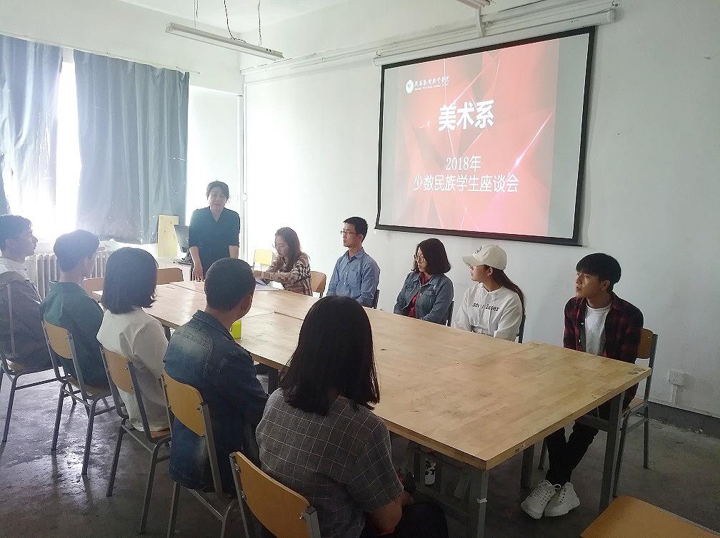 为认真落实《陕西艺术职业学院“四进两联一交友”活动实施方案》文件精神,深入了解少数民族学生在校学习生活情况,促进各民族学生间的沟通交流和文化交融,2018年4月2日美术系召开少数民族学生座谈会。会议由美术系直属支部副书记马爱军主持、行政秘书范译匀、辅导员雷雅西、刘治国,及16、17级全体少数民族学生参加了本次会议。